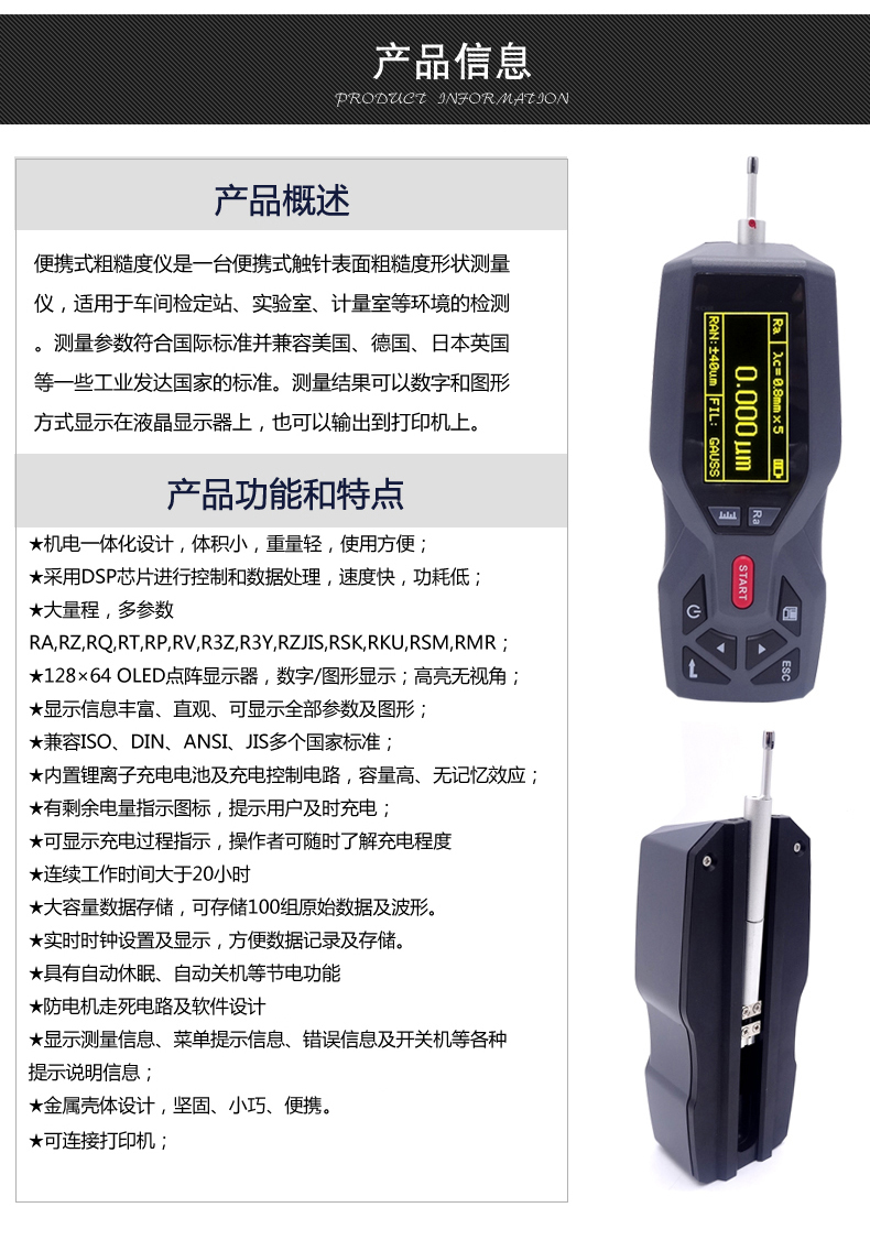 ★采用DSP芯片進(jìn)行控制和數(shù)據(jù)處理,速度快,功耗低;大量程,21個(gè)參數(shù),多參數(shù)Ra,Rz,Rq,Rt,Rp,Rv,R3z,R3y,RzJIS,Rsk,Rku,Rsm,,Rs,Rpc,Rk,Rpk,Rvk,Ry,Mr1,Mr2,Rmax,;