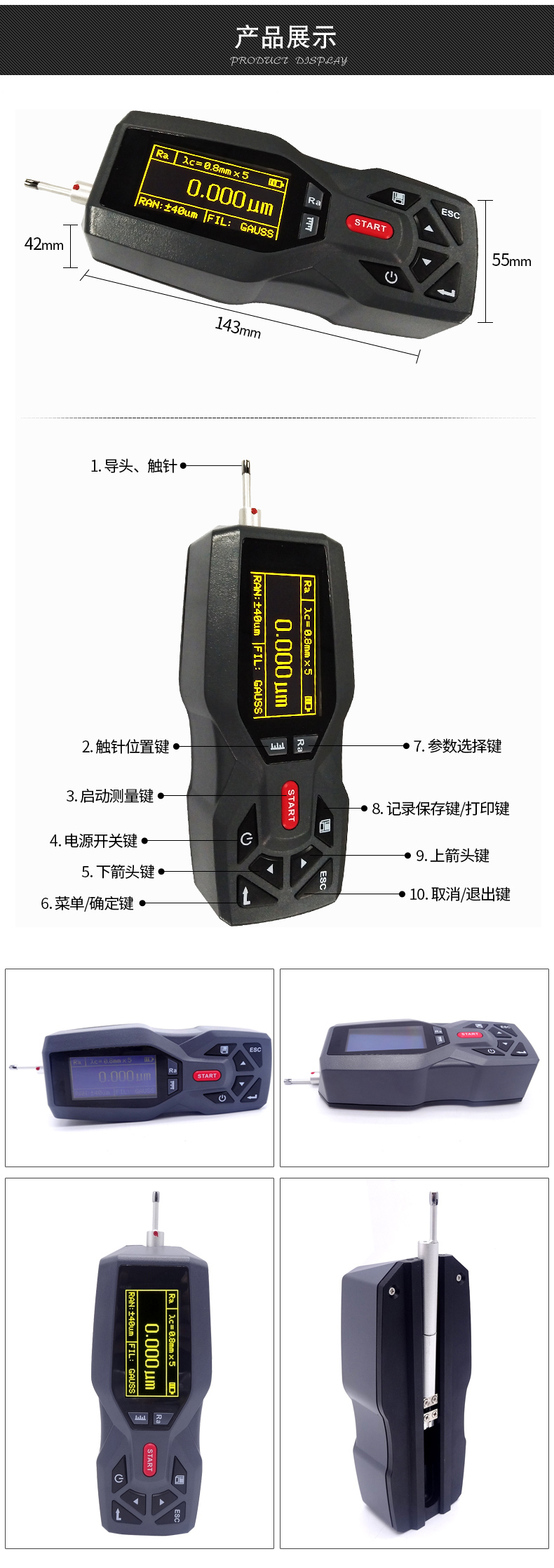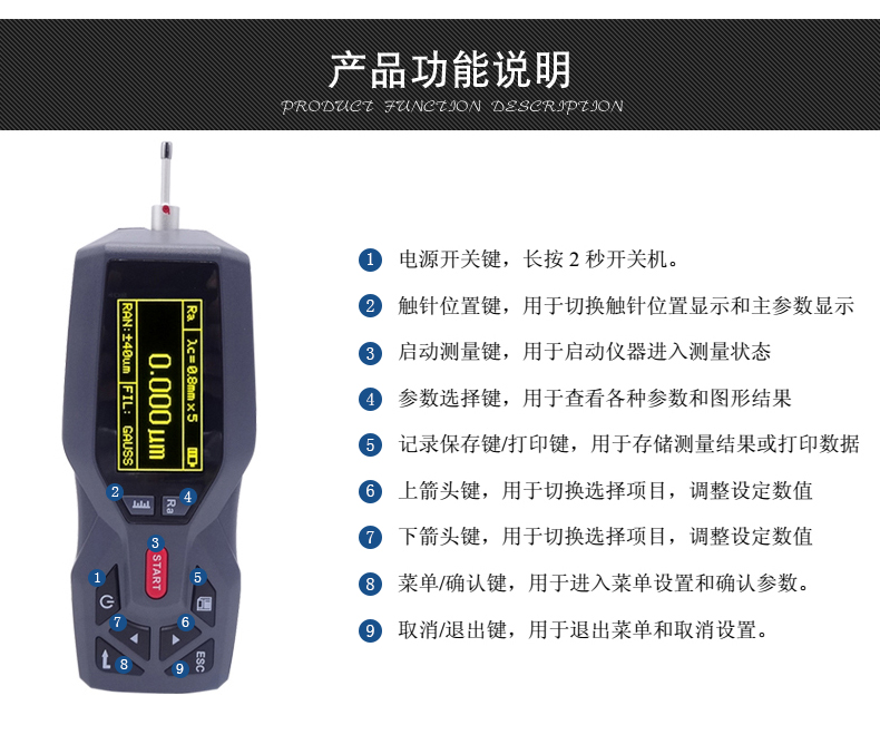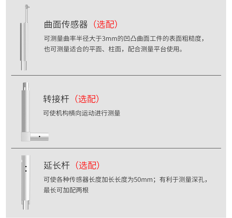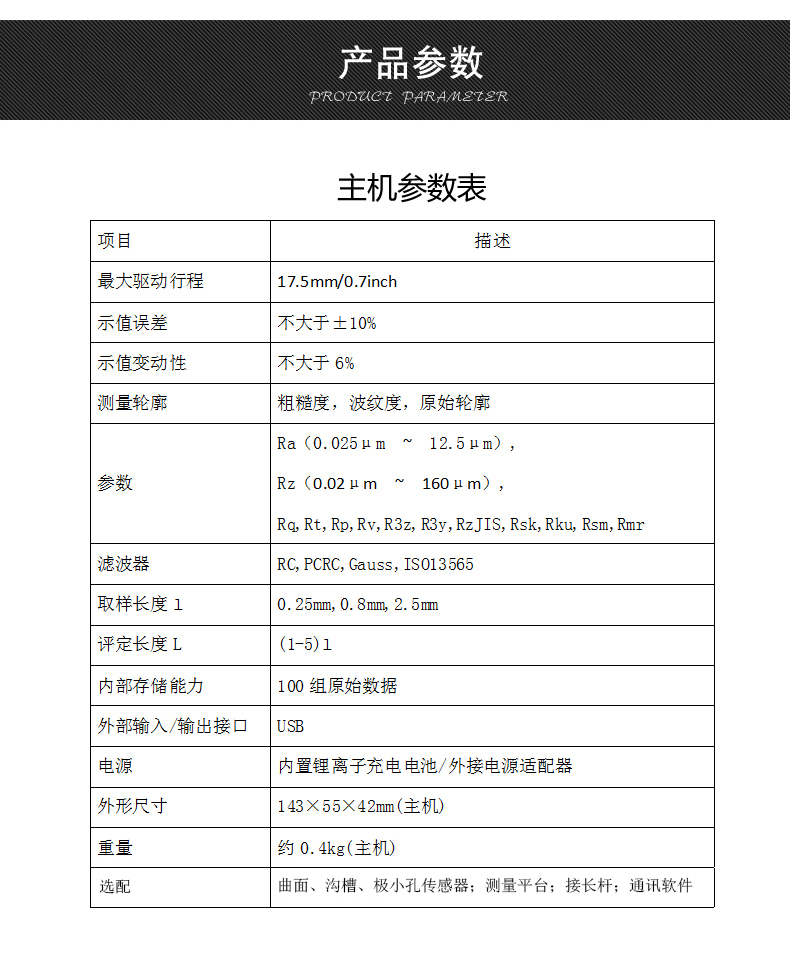 大量程,多參數(shù)Ra,Rz,Rq,Rt,Rp,Rv,R3z,R3y,RzJIS,Rsk,Rku,Rsm,Rmr;