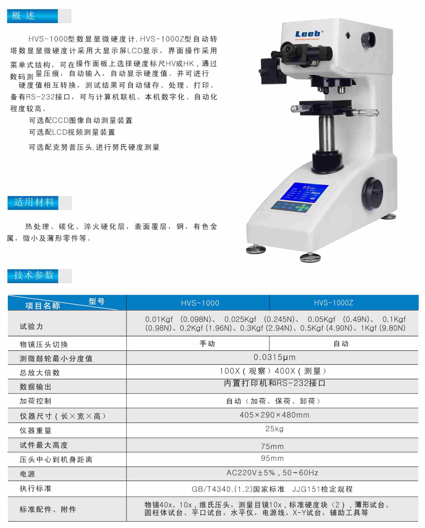 HVS-1000型數(shù)顯顯微硬度計(jì),HVS-1000Z型自動轉(zhuǎn)塔數(shù)顯顯微硬度計(jì)采用大顯示屏LCD顯示,界面操作采用菜單式結(jié)構(gòu),可在操作面板上選擇硬度標(biāo)尺HV或HK,通過數(shù)碼測量壓痕,自動輸入,自動顯示硬度值。