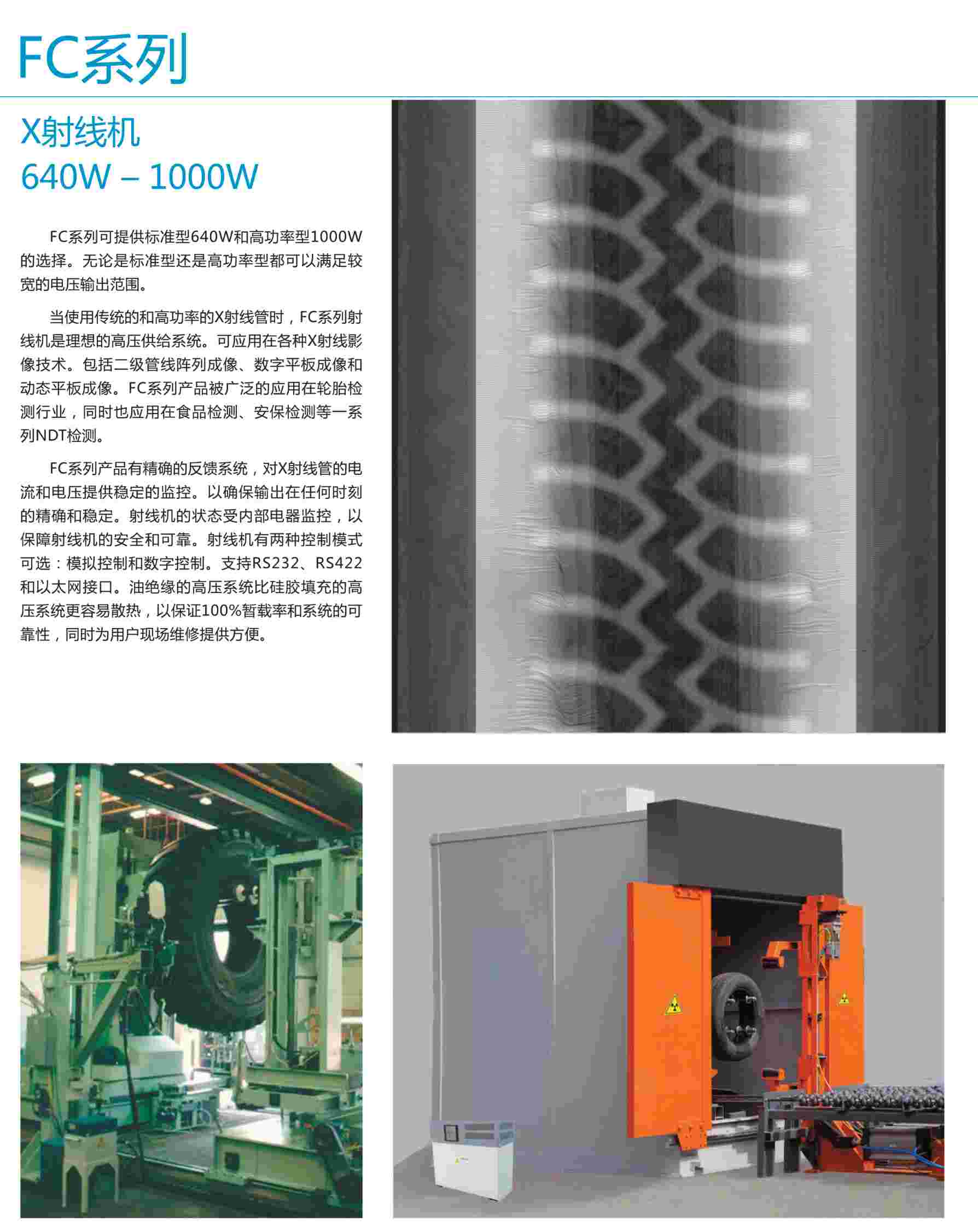 當使用傳統(tǒng)的和高功率的X射線管時,F(xiàn)C系列射線機是理想的高壓供給系統(tǒng)??蓱迷诟鞣NX射線影像技術。包括二極管線陣列成像、數(shù)字平板成像和動態(tài)平板成像。FC系列產(chǎn)品被廣泛的應用在輪胎檢測行業(yè),同時也應用在食品檢測、安保檢測等一系列NDT檢測。