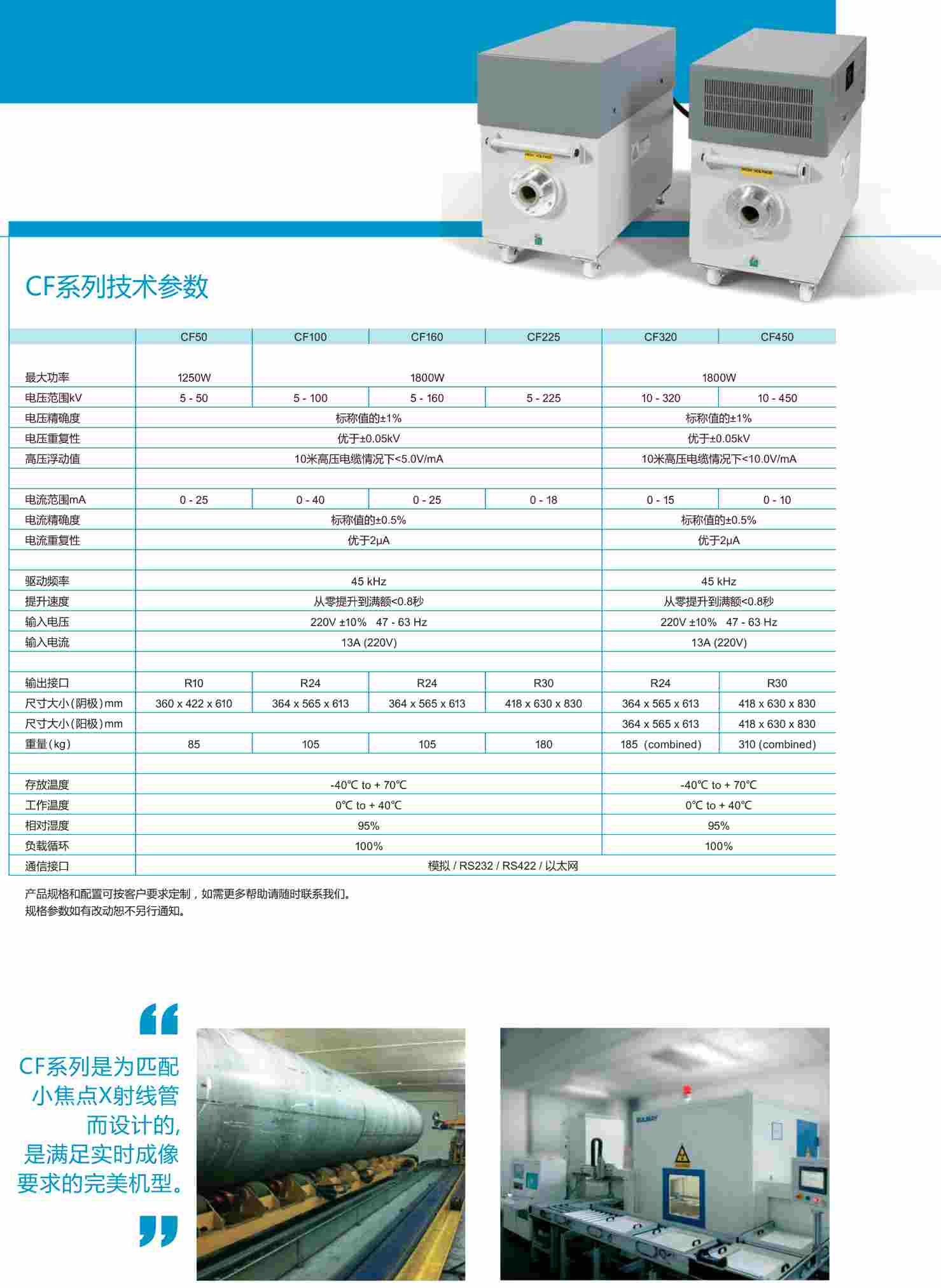 CF系列射線機(jī)的設(shè)計(jì)理念是提供性價(jià)比高的解決方案。利用45kHz的高壓工作頻率和高美特有的可變頻技術(shù),既可以滿足小焦點(diǎn)的X射線管,又滿足高輸出功率的射線管,CF系列射線機(jī)成為實(shí)用、多功能場(chǎng)合應(yīng)用的產(chǎn)品。廣泛應(yīng)用在NDT實(shí)時(shí)成像及各種測(cè)量和精度校準(zhǔn)系統(tǒng)上。