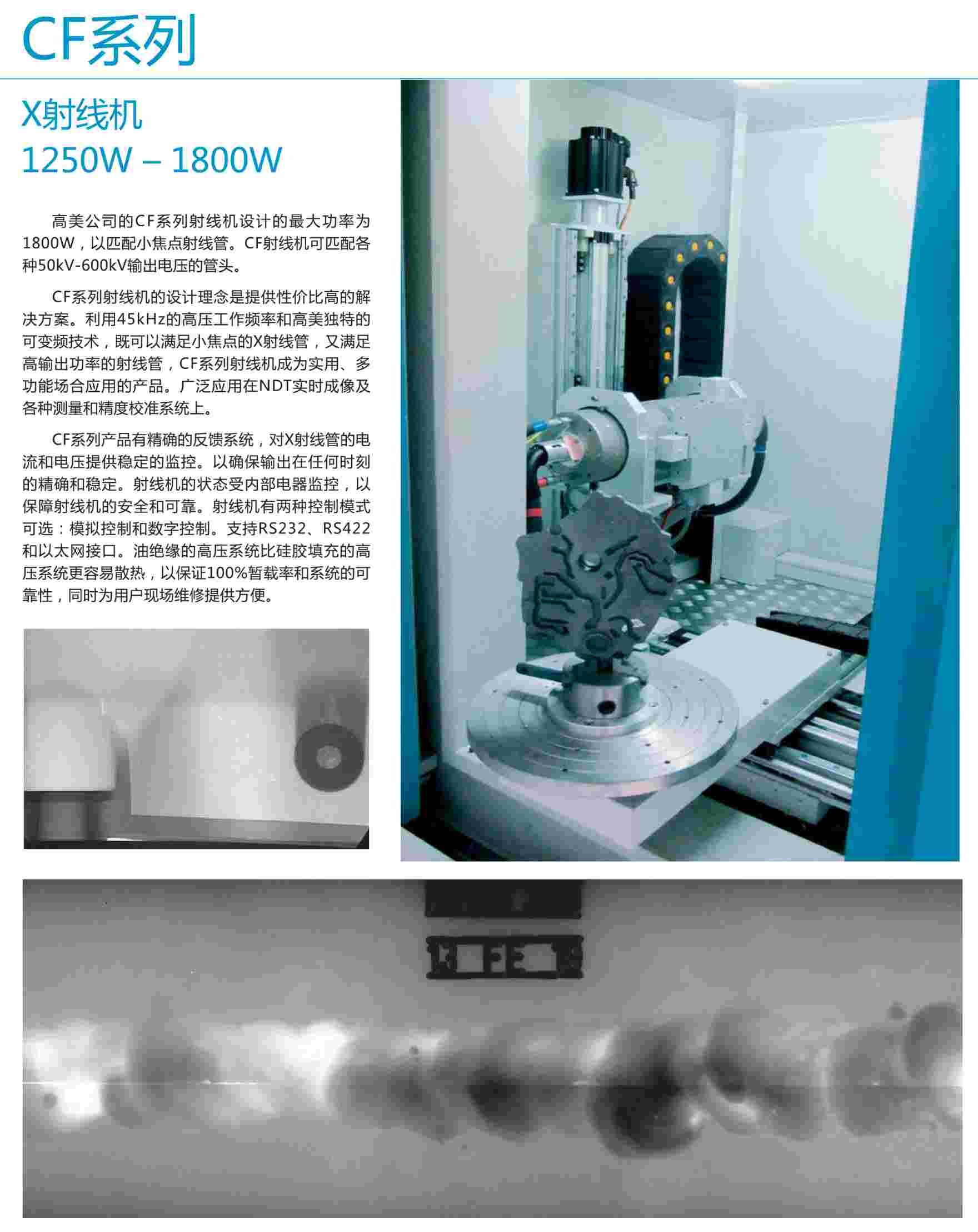 高美公司的CF系列射線機(jī)設(shè)計(jì)的最大功率為1800W,以匹配小焦點(diǎn)射線管。CF射線機(jī)可匹配各種50kv-600kv輸出電壓的管頭。