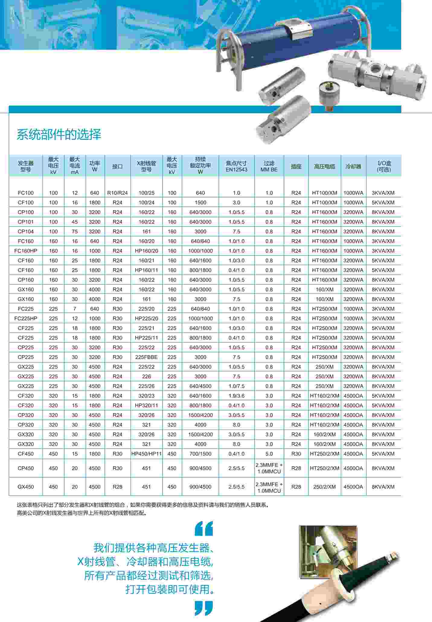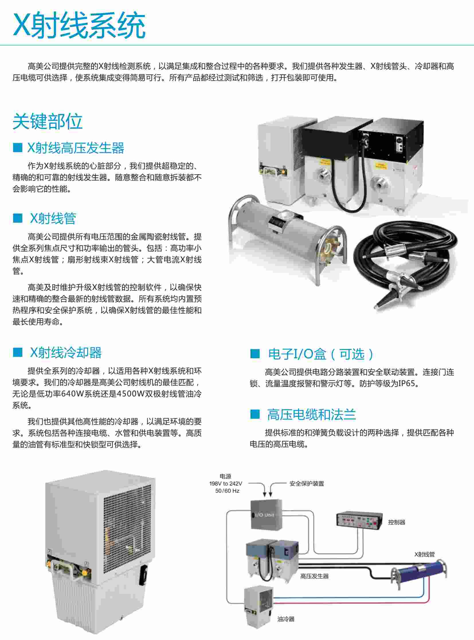 高美公司提供完整的X射線檢測(cè)系統(tǒng),以滿足集成和整合過(guò)程中的各種要求。我們提供各種發(fā)生器、X射線管頭、冷卻器和高壓電纜可供選擇,使系統(tǒng)集成變得簡(jiǎn)易可行。所有產(chǎn)品都經(jīng)過(guò)測(cè)試和篩選,打開(kāi)包裝即可使用。