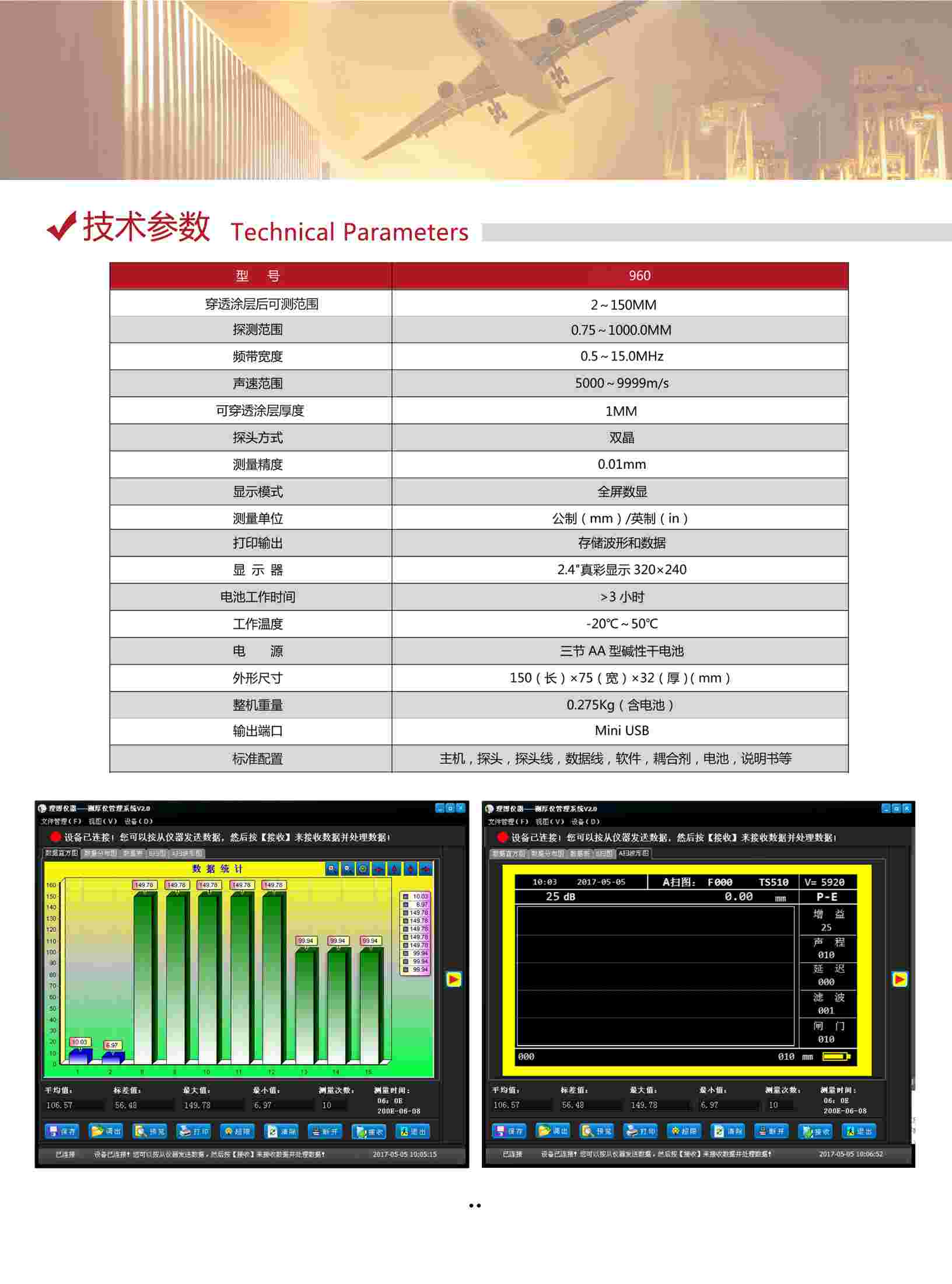 ● 專業(yè)的數(shù)據(jù)處理軟件,基于Windows的Uee?960接口程序用于收集、創(chuàng)建、打印及管理來自Uee?960測(cè)厚儀的數(shù)據(jù)。顯示數(shù)據(jù)集和測(cè)量總結(jié)文件,文件包含厚度讀數(shù)、測(cè)厚儀設(shè)置值及探頭設(shè)置值,AScan波形和BScan圖形。