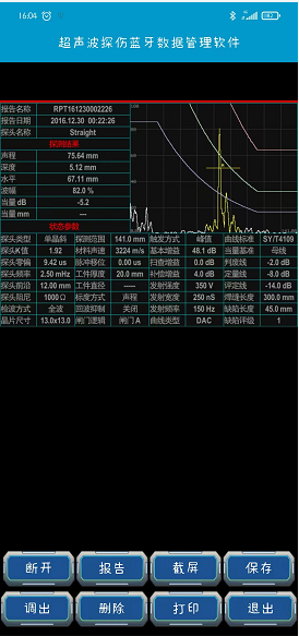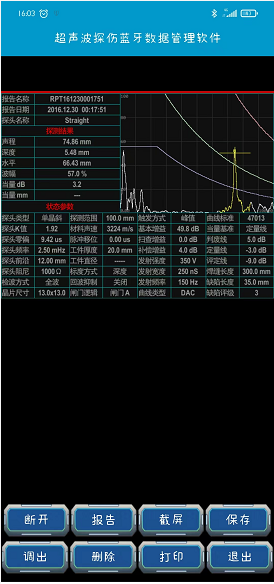 焊接接頭檢測過程中,可以實時在儀器內(nèi)保存探傷報告并通過藍牙連接傳輸?shù)绞謾C上,通過手機App截屏,并可以現(xiàn)場連接藍牙打印機打印實時打印探傷報告。