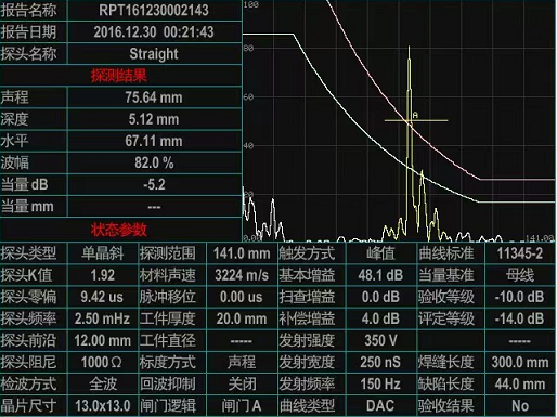 五、 探傷方式及探頭選擇:檢測焊縫的缺陷,推薦使用橫波斜探頭進行檢測,探頭參數(shù)根據(jù)焊縫母材厚度進行選擇,此處工件母材厚度20mm,選擇5P13*13K2的單斜探頭。