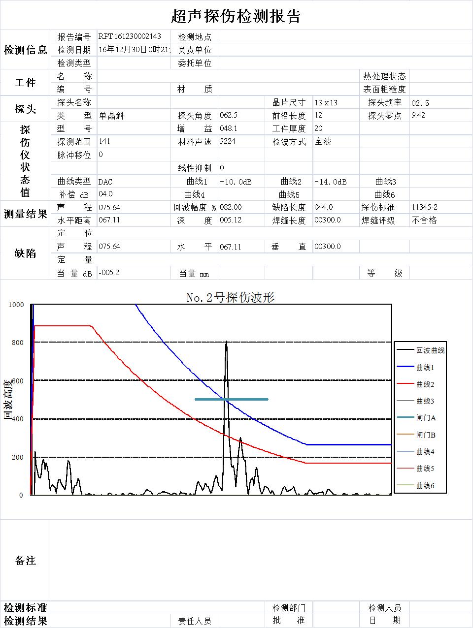 除了能現(xiàn)場藍牙無線連接,手機APP生成探傷報告,并實現(xiàn)現(xiàn)場打印報告之外,還能通過U盤連接電腦生成帶有智能評級的EXCEL格式的探傷報告。