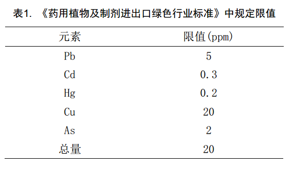 國外對于藥物中金屬元素的殘留量有嚴格限制。根據(jù)歐洲藥物評審委員會(EMEA) 頒布的金屬催化劑或金屬試劑殘留量限度規(guī)定,在藥品中可能殘留的元素分為3 大類(Pt、 Pd、 Ir、 Rh、 Ru、Os、Mo、 Ni、 Cr、 V; Cu、 Mn; Fe、 Zn),其含量大多數(shù)較低,僅為mg /kg 級。 我們國家也有對于的規(guī)定,《藥用植物及制劑進出口綠色行業(yè)標準》中對相關(guān)元素就有規(guī)定限值,規(guī)定值見表1.