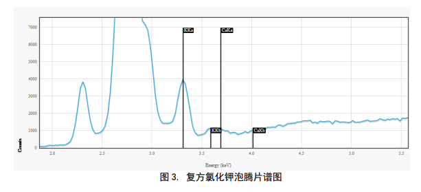 對于引起的低鉀血癥通常情況下采用電解質(zhì)補充藥,復方氯化鉀泡騰片則是一種電解質(zhì)補充藥。對于藥品里的鉀元素含量分析,藥典里都有闡述,但相關(guān)對不適應現(xiàn)場快篩監(jiān)測,采用牛津儀器X-MET8000系列HHXRF儀器可以進行篩選,判斷成份含量。圖3是對藥品進行譜圖掃描,鉀元素的譜線非常清晰。