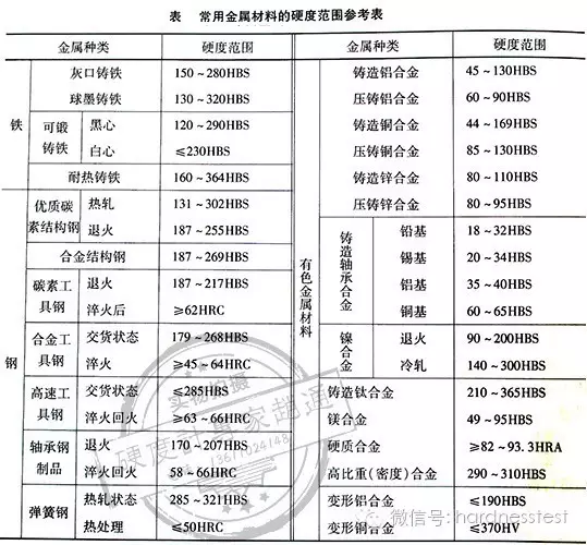 在檢測硬度之前我們先應對被測工件的硬度值做一個大概范圍的估計,如果估計不出大概的硬度值可按較高的硬度來選擇。(注:可參考常用金屬材料的硬度范圍參考表)