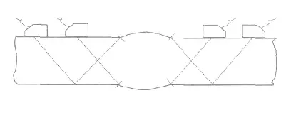 1.2.1 焊角反射回波具有單側檢測特征。只有遠離探頭一側的焊角才可能產(chǎn)生焊角回波, 即焊角回波只能在與其相對的一側才能探測到。如圖3 所示, 靠近探頭側的焊角由于其輪廓法線方向與超聲波入射方向近于垂直, 不產(chǎn)生焊角反射。而焊趾裂紋和咬邊反射在焊縫兩側都能探測到, 根據(jù)這一特征可采用雙側探測法予以區(qū)別。