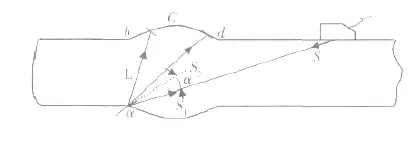 如圖4 所示, 當超聲波主聲速方向與焊角處輪廓法線方向之夾角α小于第三臨界角αⅢ時, 界面處除反射1 個橫波S2 外, 還會產(chǎn)生1 個變型縱波L。當α遠小于αⅢ時, 變型縱波L 會射至c、b 等處, 相應地, 反射橫波S2 會射至c、d 等處, 這些地方的輪廓法線方向與聲波入射方向相同或相近, 因此會在示波屏上產(chǎn)生2 個反射回波, 即L 與S2。另外, 由于α較小, 入射聲速S 的一部分會直接由焊角處返回探頭, 形成焊角回波S1。這樣, S1、S2 與L 波形成1 個如漢字“山”形的回波群, 故稱“山形回波”。