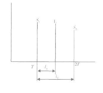 2.2.1 如圖4 所示, “山形回波”中L 波與S2 波聲程相近, 但L 波為變型縱波, 而縱波聲速遠大于橫波聲速, 所以在熒屏上L 波落在S2 波之前。以鋼焊縫為例, 其縱波聲速CL=5 900 m/s, 橫波聲速CS=3 230 m/s, 設L 波與S2 波聲程相等, 則l1/l2=CS/CL=0.55(l1、l2 見圖5), 即在熒光屏上, L 波位于S1 與S2 波之間距的0.55 倍處( 與S1 的距離) 。而S2 波在熒屏上的具體位置則與定位方法有關。設S2 波的實際聲程為SⅡ, 則: