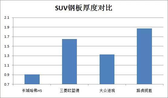 不同的車型有著各自不同的用途和設計理念。目前大行其道的城市型SUV出于成熟車型平臺,單從檢測數(shù)據(jù)看,其基本保持了與母平臺車型較相同的鋼板厚度水平,且在剛性上略有進步;而對于像路虎這類的越野車來說,比普通城市SUV需要較厚的鋼板做防護。因此路虎品牌也成了這次檢測中,平均鋼板厚度有點厚的品牌,旗艦車型攬勝也是這次檢測中鋼板厚度有點厚的車型。