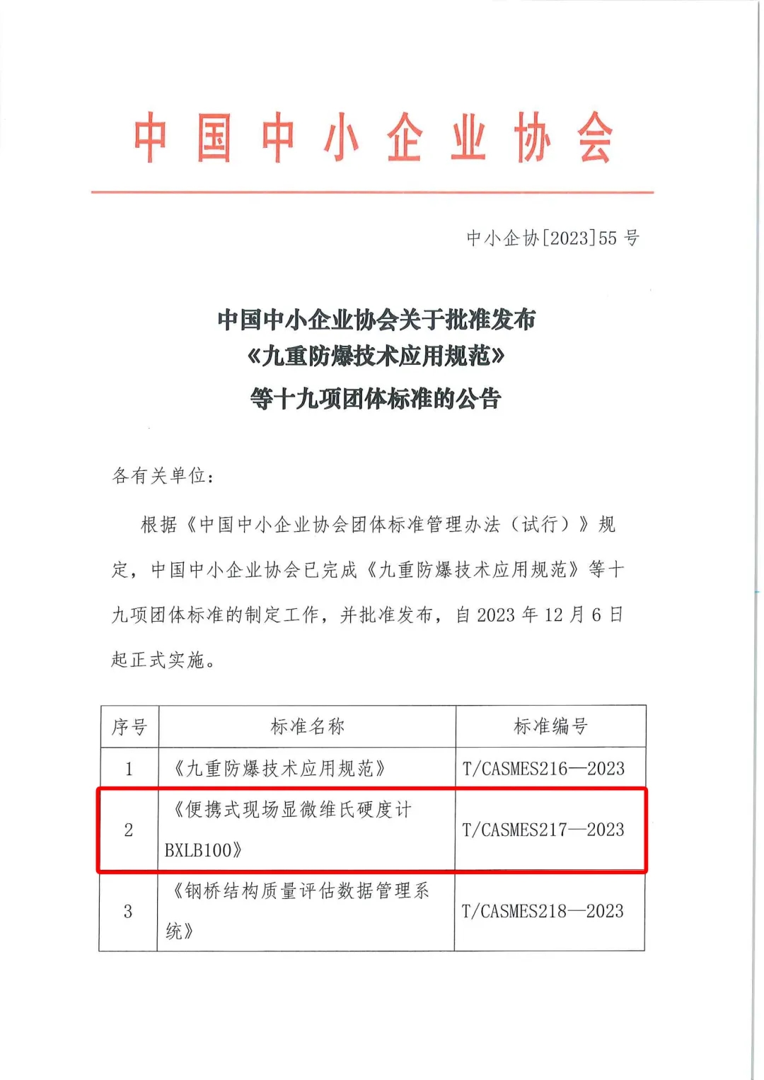 2023年12月6日,由我公司里博儀器牽頭制定的《便攜式現(xiàn)場顯微維氏硬度計BXLB100:T/CASMES217-2023》團體標準正式發(fā)布并實施,該項標準是我公司發(fā)布的首項全國性團體標準。